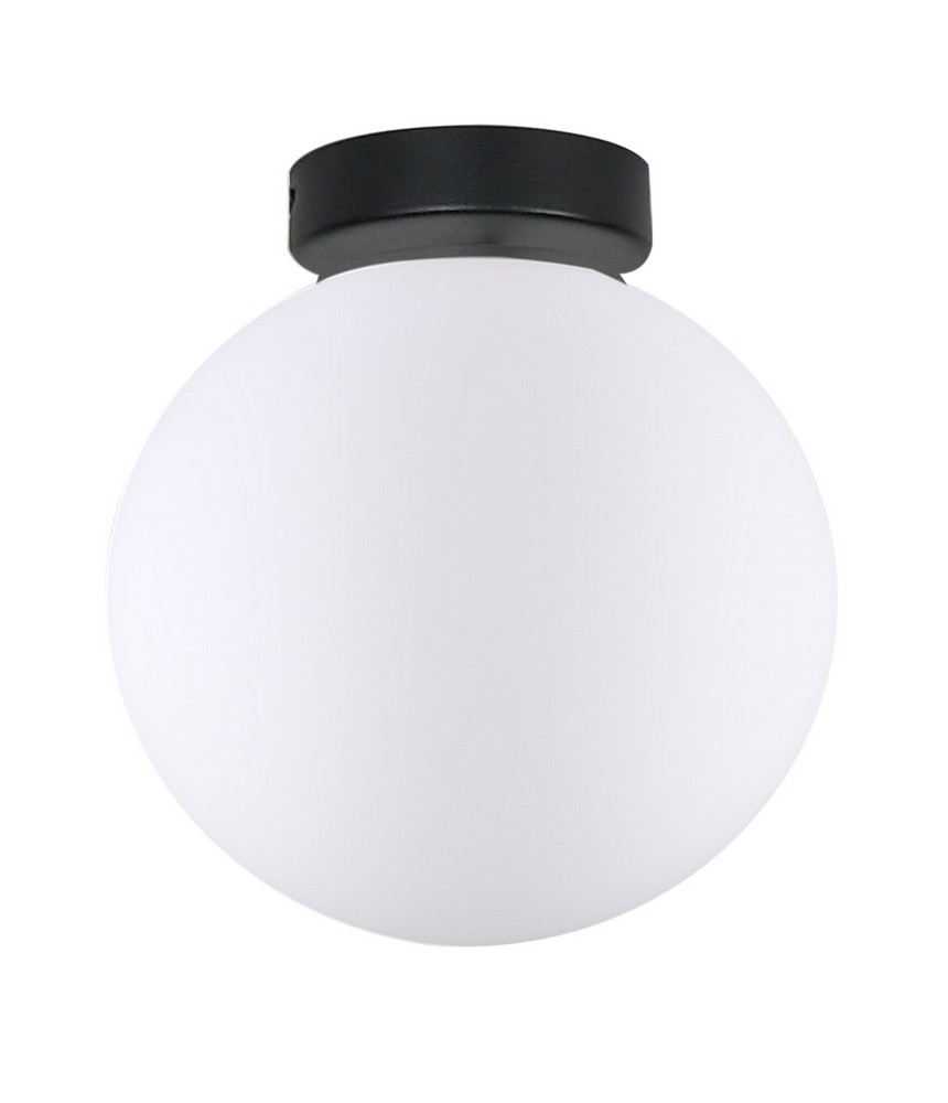 Μοντέρνα πλαφονιέρα με γυάλινη σφαίρα σε λευκό χρώμα και μεταλλική μαύρη βάση.