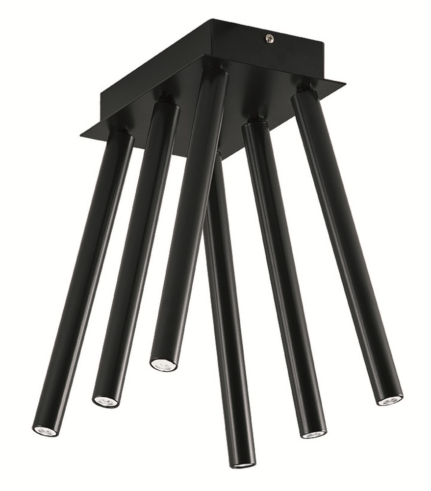 Μοντέρνα εξάφωτη πλαφονιέρα με δυνατότητα κίνησης και φωτισμό μονής κατεύθυνσης, κατασκευασμένη από αλουμίνιο σε μαύρο χρώμα.
