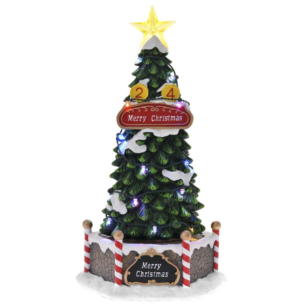 Χριστουγεννιάτικο φωτιζόμενο δενδράκι που γυρνάει γύρω-γύρω και παίζει και μουσική. Λειτουργεί με μπαταρίες που δεν περιέχονται. Υλικό κατασκευής πολυρεζίνη και πλαστικό. Η μουσική έχει κουμπί On/Off.