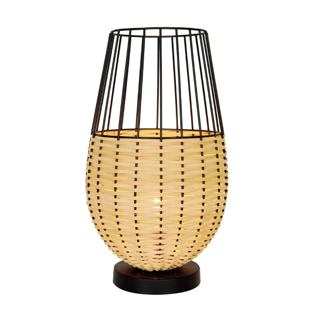 Επιτραπέζιο φωτιστικό με πλέξη από ρατάν σε φυσικό χρώμα και μεταλλικό μαύρο σκελετό.