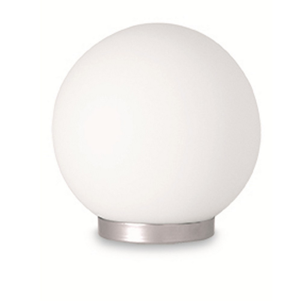 Επιτραπέζιο φωτιστικό με λευκό γυαλί οπάλ σατινάτο και μεταλλική βάση σε νίκελ ματ χρώμα.