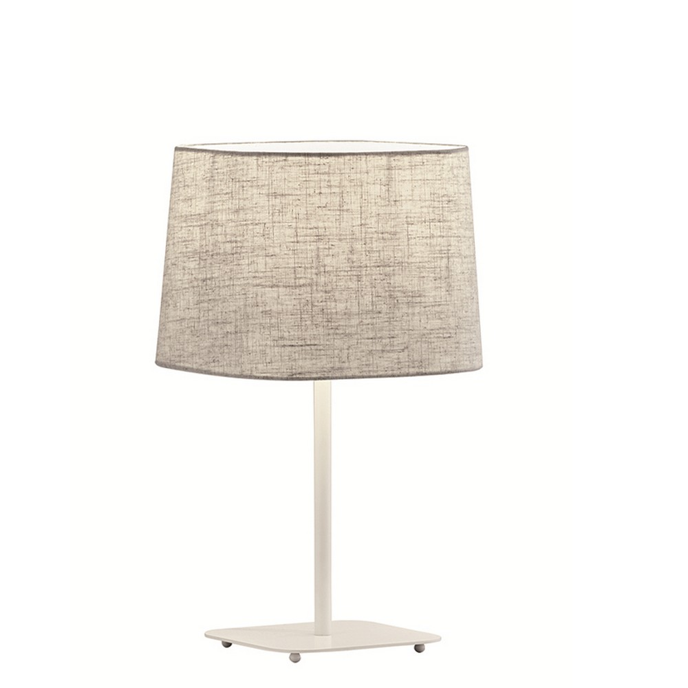 Επιτραπέζιο φωτιστικό με μπεζ καπέλο από πλαστικοποιημένο λινό ύφασμα και μεταλλική λευκή βάση.