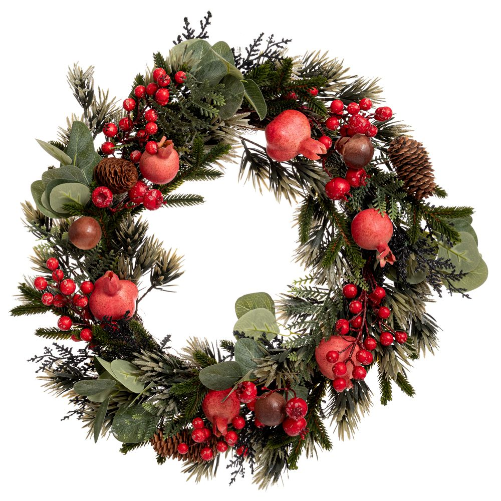 Πράσινο γιορτινό στεφάνι διακοσμημένο με ρόδι, μανιτάρια, μούρα και κουκουνάρι. Δημιουργεί μια ζεστή και φυσική ατμόσφαιρα, ιδανικό για στολισμό πόρτας, τοίχου ή τραπεζιού κατά την περίοδο των γιορτών. Προσθέτει παραδοσιακή χριστουγεννιάτικη ομορφιά σε κάθε χώρο