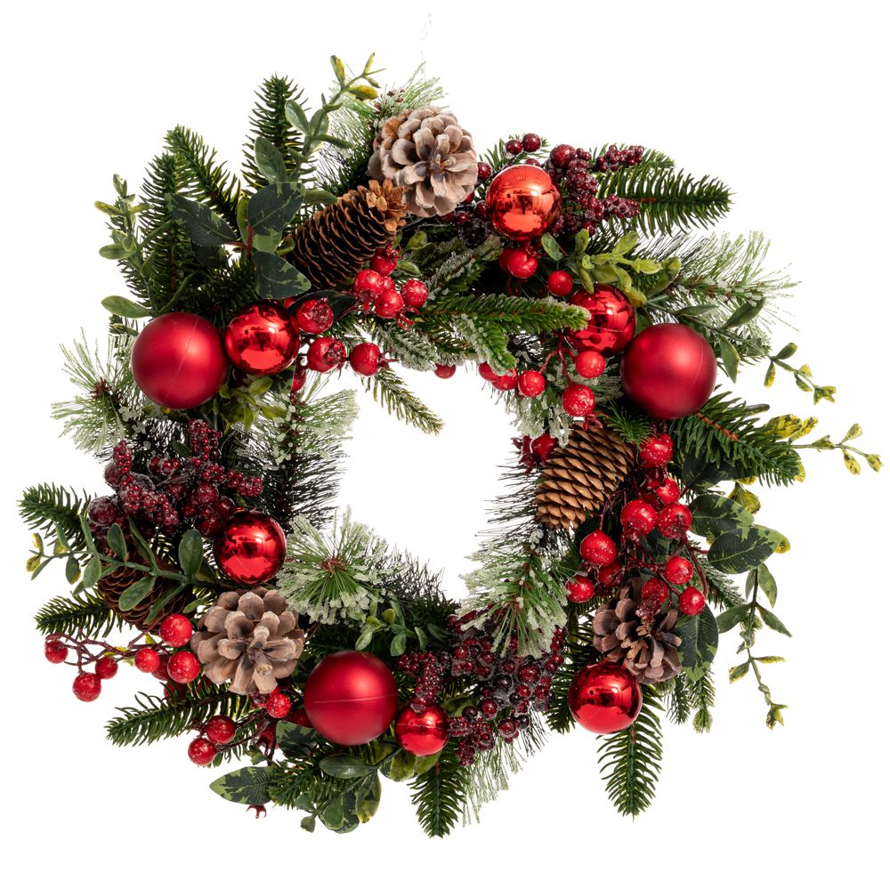 Πράσινο γιορτινό στεφάνι με κόκκινα berries, μπάλες και παγωμένα κουκουνάρια. Μια κομψή και εντυπωσιακή πρόταση για τη χριστουγεννιάτικη διακόσμηση, που συνδυάζει φυσικά στοιχεία με λαμπερές λεπτομέρειες. Ιδανικό για πόρτες, τοίχους ή ως centerpiece στο γιορτινό τραπέζι.