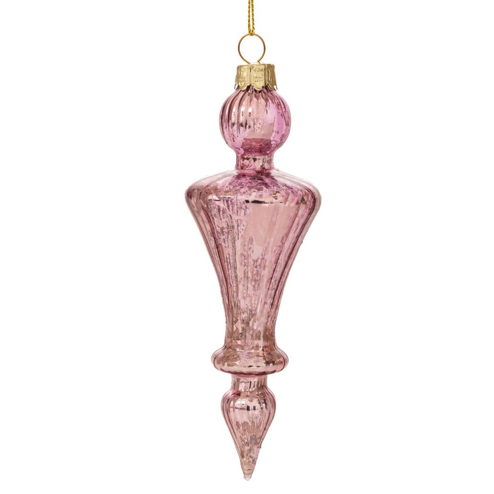 Γυάλινο διακοσμητικό σε σχήμα σταλακτίτη σε ροζ αντικέ απόχρωση, ιδανικό για χριστουγεννιάτικα δέντρα και γιορτινές συνθέσεις. Προσφέρει κομψότητα και γιορτινή λάμψη, δημιουργώντας εντυπωσιακή και παιχνιδιάρικη ατμόσφαιρα στον χώρο.