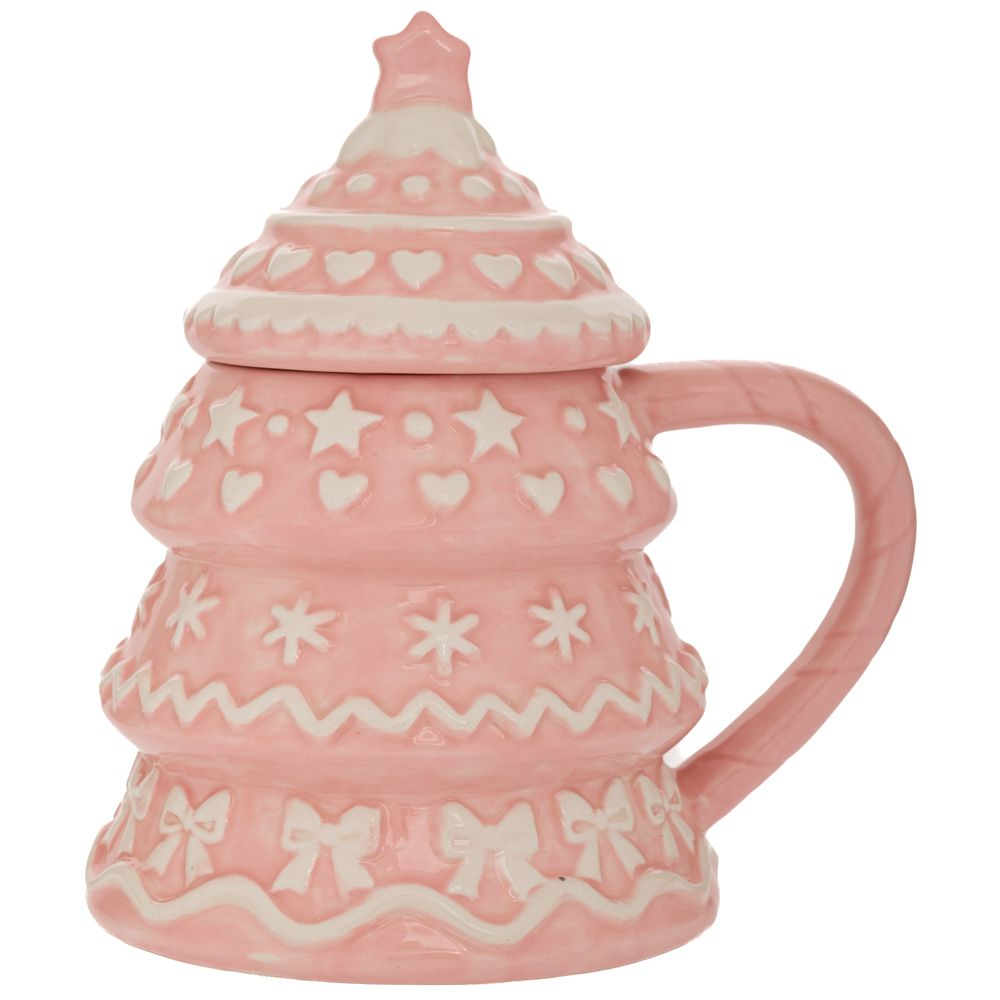 Ροζ κεραμική κούπα με καπάκι σε σχήμα έλατο, διαστάσεων 13x10x16εκ. Ιδανική για ζεστά ροφήματα τις γιορτινές μέρες, προσφέροντας ταυτόχρονα μια γιορτινή και χαριτωμένη διακόσμηση στην κουζίνα ή στο τραπέζι.