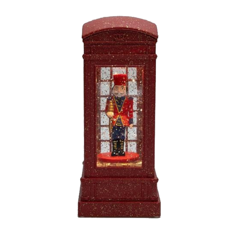 Ο τηλεφωνικός θάλαμος σε κόκκινη απόχρωση, με καρυοθραύστη και νερό στο εσωτερικό, ύψους 21cm, είναι ένα εντυπωσιακό γιορτινό διακοσμητικό. Φωτιζόμενος και με δυνατότητα λειτουργίας με μπαταρίες και χρονόμετρο (timer), προσφέρει μαγική λάμψη και χαριτωμένη ατμόσφαιρα σε κάθε χώρο. Ιδανικός για δέντρο, τραπέζι ή βιτρίνα, ενισχύει τη γιορτινή διακόσμηση με ένα μοναδικό θέμα.