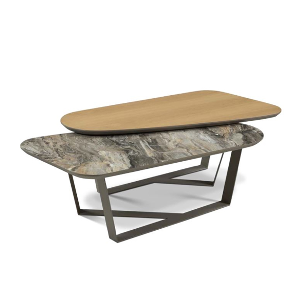 Τραπεζάκι σαλονιού δυο τεμαχίων με ιδιαίτερο σχεδιασμό. Με μεταλλική βάση και επιφάνειες από δρύ και HPL.