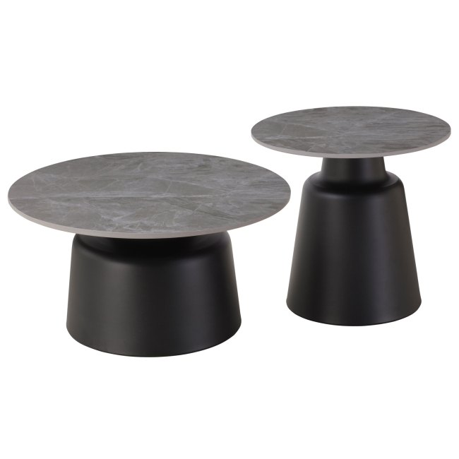 Σετ τραπεζιών σαλονιού με κεραμική επιφάνεια σε γκρι μαρμάρινη όψη, διαμέτρων Φ50εκ και Φ70εκ. Η σταθερή μεταλλική βάση σε συνδυασμό με την κομψή κεραμική επιφάνεια προσφέρει στιβαρότητα και μοντέρνα αισθητική. Ιδανικά για καθιστικό, lounge ή σαλονάκι, προσφέροντας λειτουργικότητα και κομψό design. Ταιριάζουν άριστα σε minimal, μοντέρνους ή industrial χώρους, ενώ η γκρι μαρμάρινη όψη δίνει διαχρονική κομψότητα.