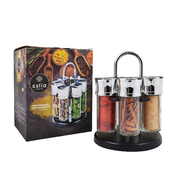 Βάση μπαχαρικών περιστρεφόμενη που αποτελείται από 6 γυάλινα βάζα με καπάκι . Μία υπέροχη και εύχρηστη επιλογή για την κουζίνα σας.