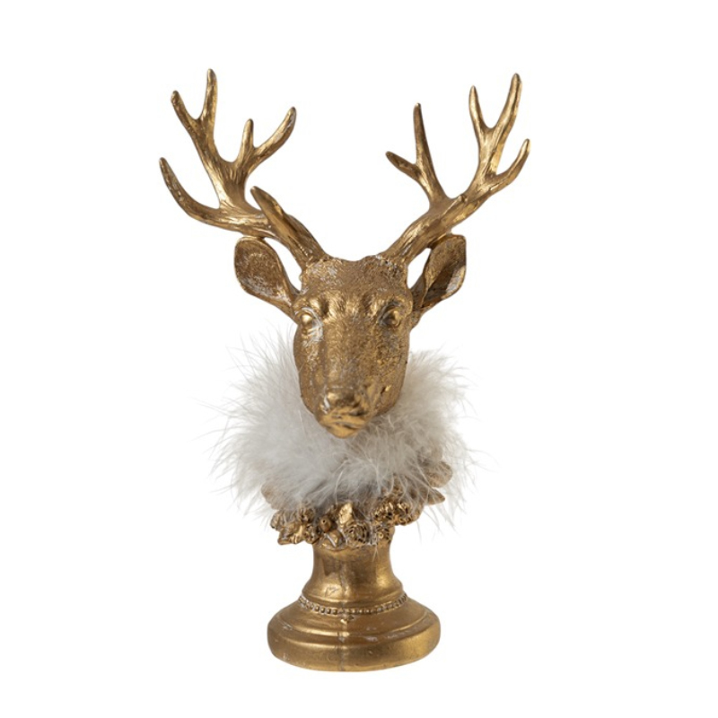 Χριστουγεννιάτικη πολυεστερική κεφαλή ταράνδου σε χρυσό με πουπουλένιες λεπτομέρειες, διαστάσεων 17x12x26εκ. Ιδανική για διακόσμηση τοίχου, τραπεζιού ή γιορτινών συνθέσεων, προσφέροντας μια κομψή και παιχνιδιάρικη γιορτινή ατμόσφαιρα. Η λεπτομερής κατασκευή και οι γιορτινές χρυσές αποχρώσεις ενισχύουν τη ζεστή εορταστική αίσθηση στον χώρο, ενώ το πουπουλένιο στοιχείο προσθέτει μοναδική υφή και στυλ.