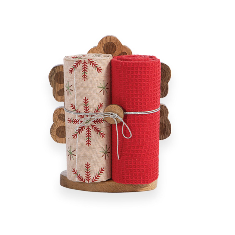 Χριστουγεννιάτικη διακοσμητική ξύλινη βάση χιονονιφάδα, με βαμβακερές πετσέτες σετ 2 τεμαχίων από 100% βαμβάκι, σε διάσταση 40x70cm.