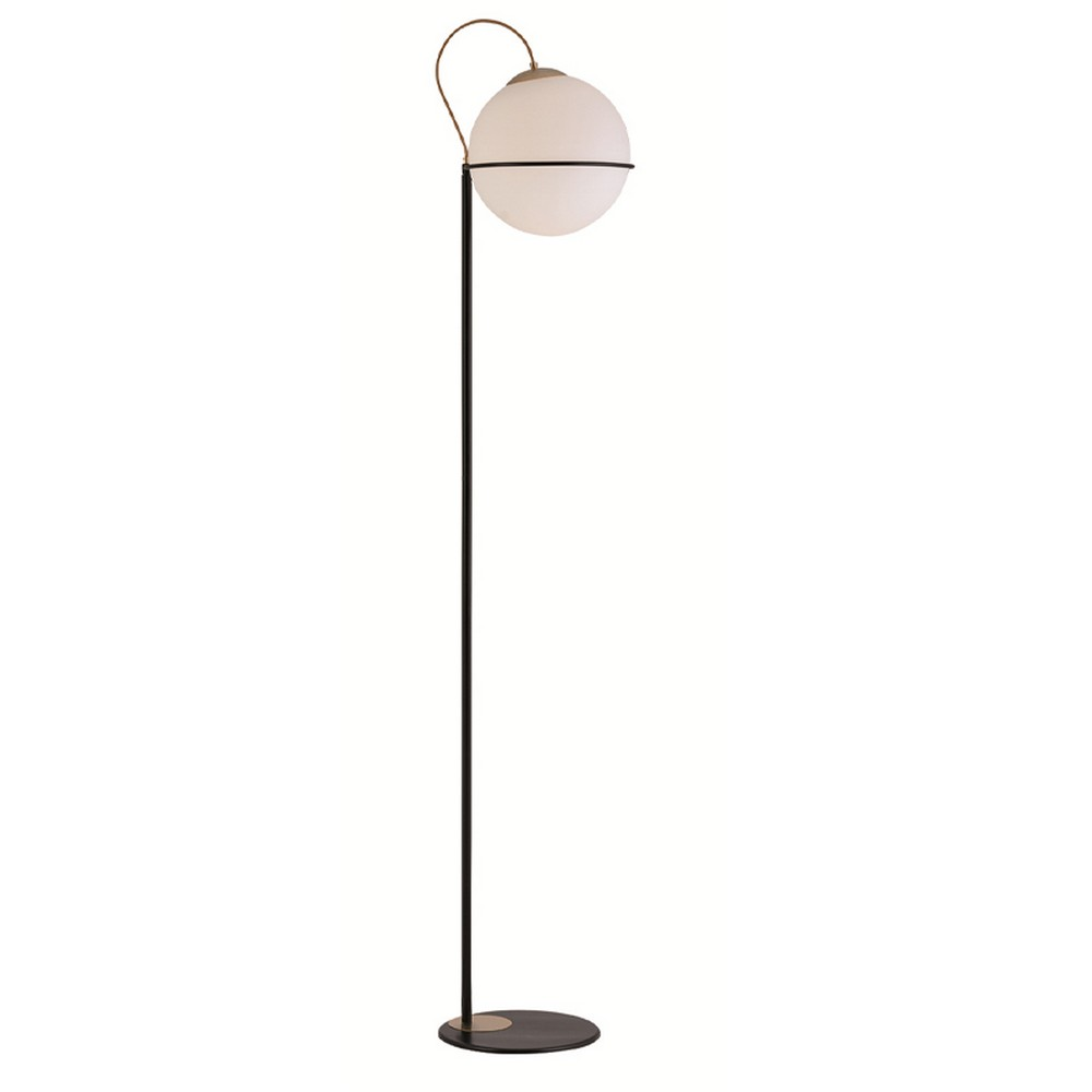 Φωτιστικό δαπέδου με γυαλί οπάλ σε λευκό ματ χρώμα και μεταλλική μαύρη βάση με χρυσές λεπτομέρειες.